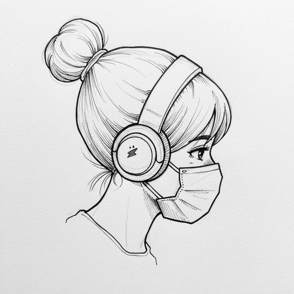 Detailed drawing of a young woman with headphones and mask, ideal for practicing your drawing skills.