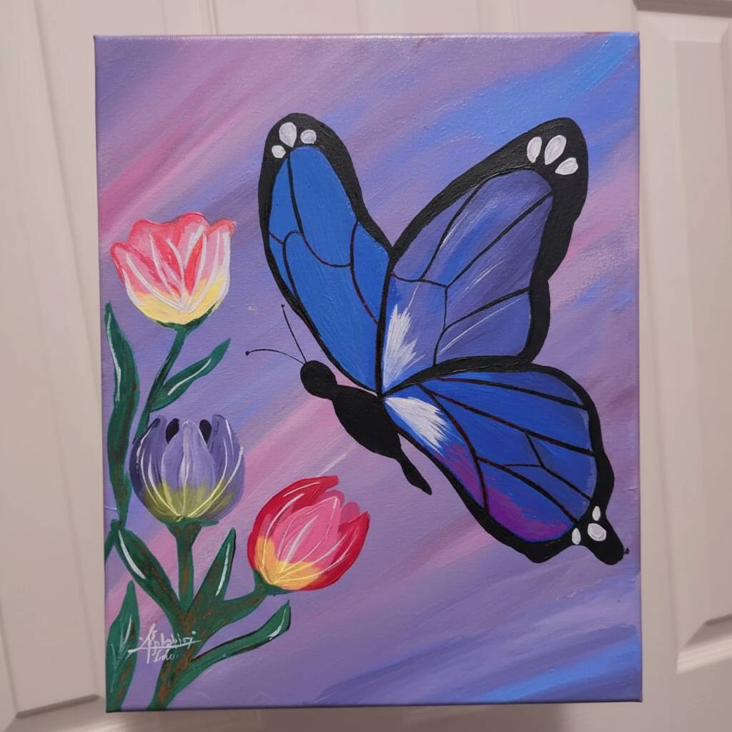 Things to Paint: blue butterfly drawing with colorful flowers