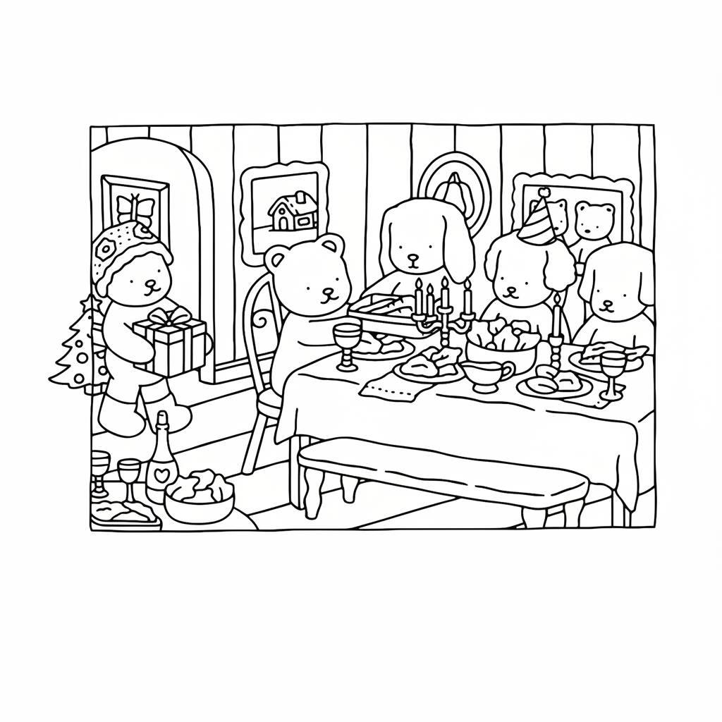 A fun coloring page featuring the Bobbie Goods characters at a Christmas dinner, perfect for children.