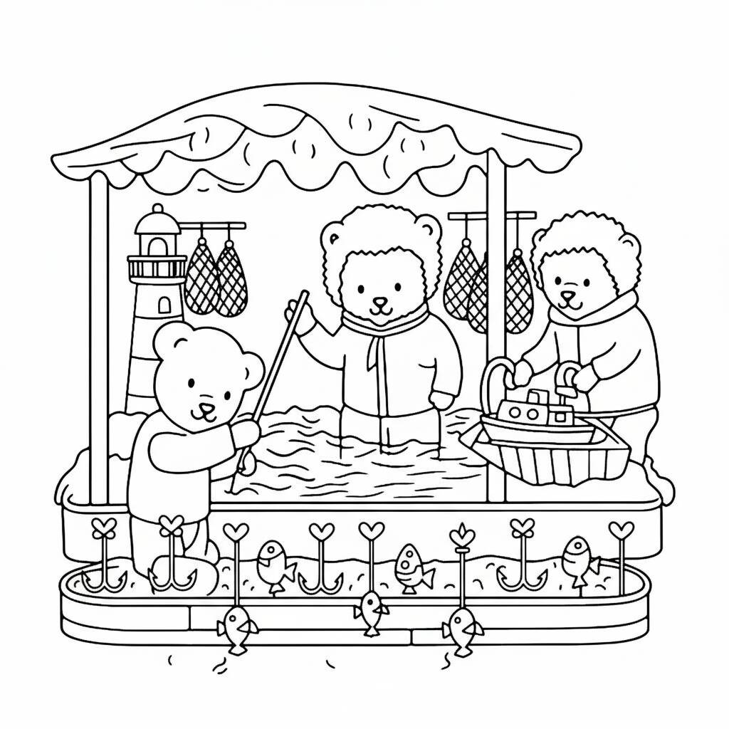 A fun scene of bear friends fishing, perfect for coloring and stimulating creativity.