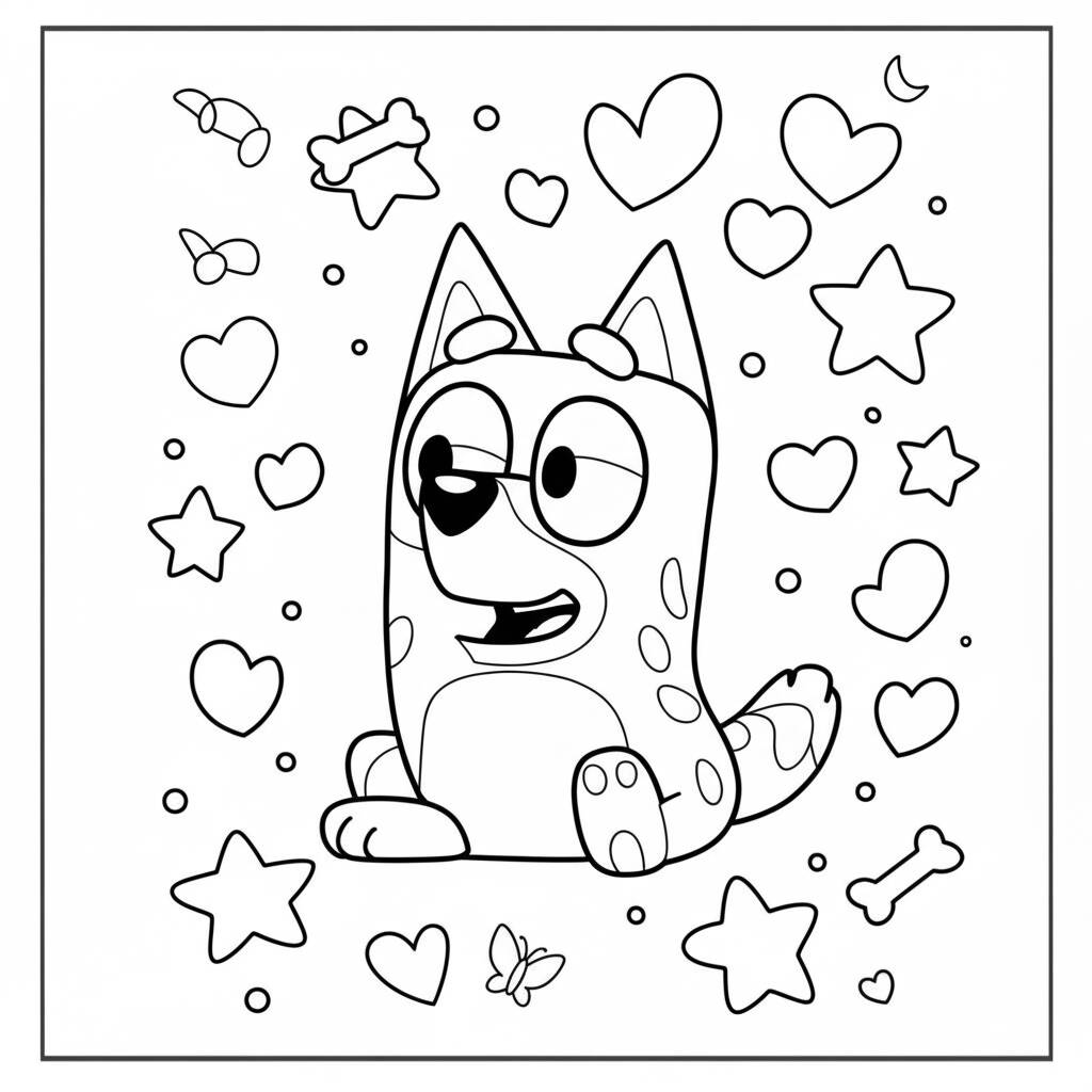 Bluey coloring page with hearts and stars