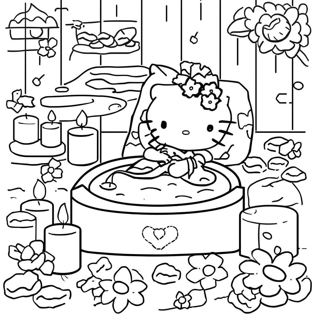 As you color the scene, imagine the soft scent of flowers and the comforting warmth of candles. Hello Kitty, with her signature bow, is ready to relax and leave her worries behind. Let your creativity flow, choosing the colors that suit you most, and transform this moment of tranquility into a unique work of art, where each tone reflects the joy and peace that she appreciates so much.