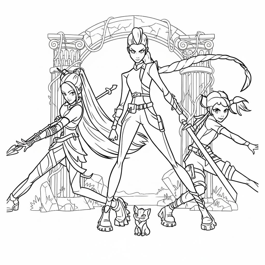 Start » Coloring Pages » K Pop Warriors coloring page with weapons (kpop Demon Hunters)