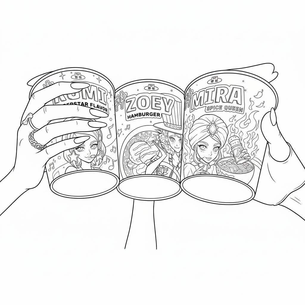 A fun coloring page featuring K-Pop Warriors Rumi, Mira and Zoey, perfect for K-Pop and art fans.