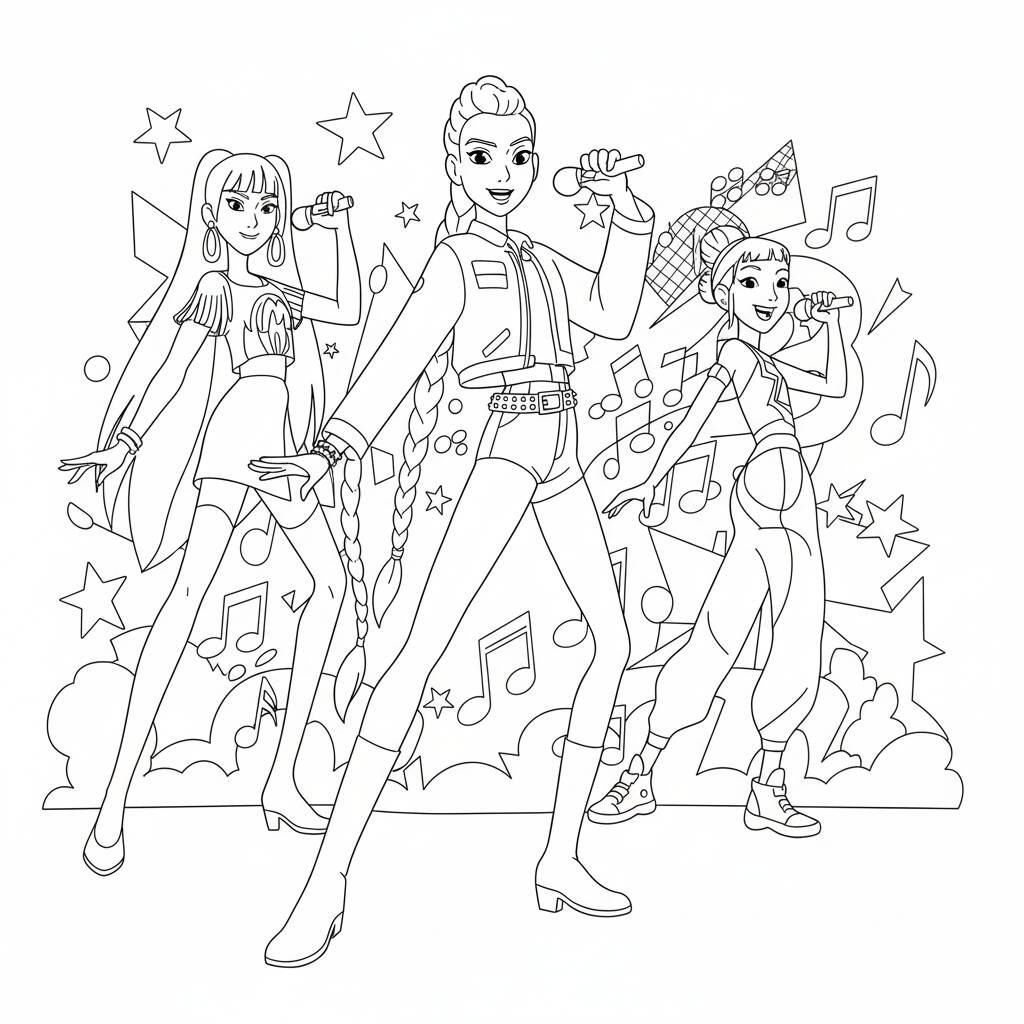 Coloring the K-Pop Warriors in a vibrant scene full of music.