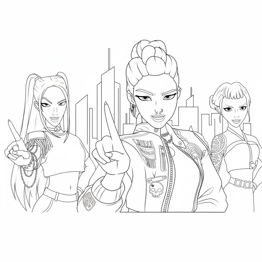 Coloring page with K-Pop Warriors in a modern and stylish style.