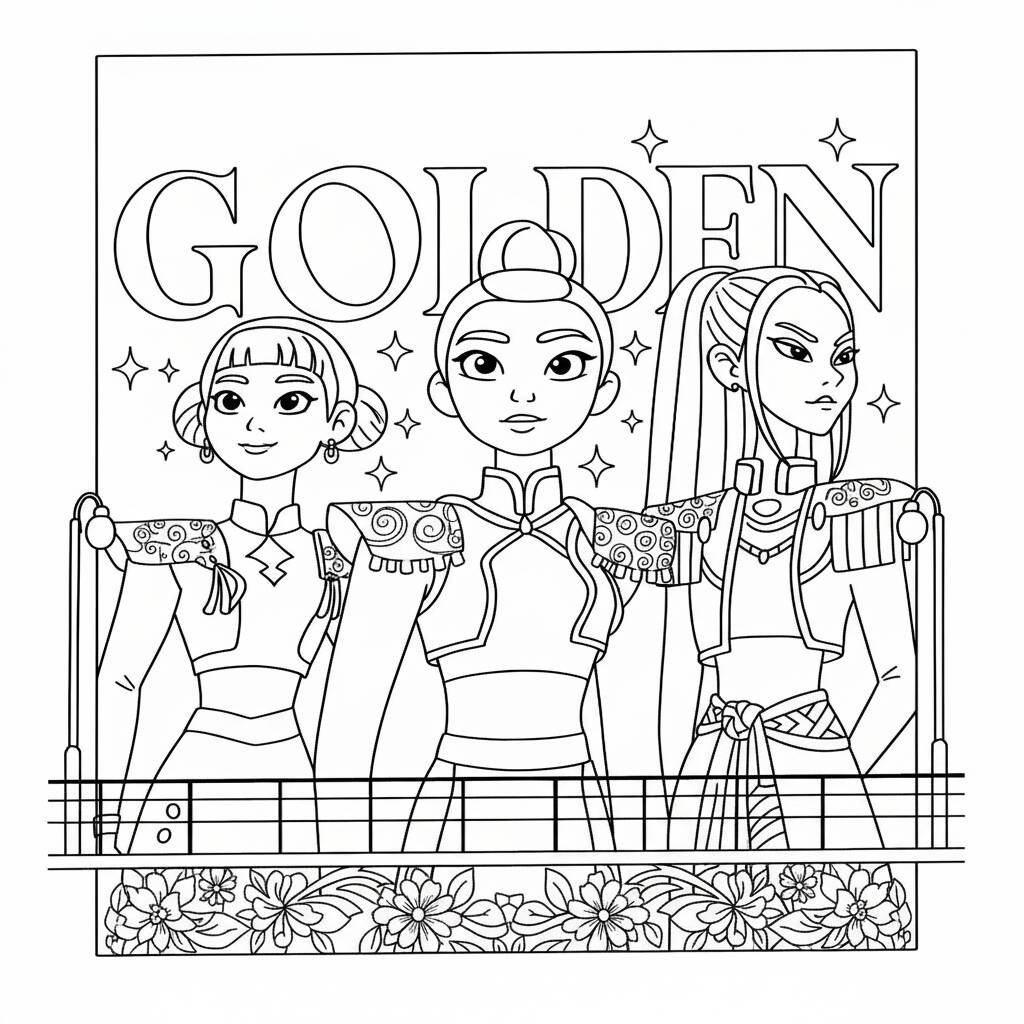 Coloring page with the Golden K-Pop Warriors, perfect for fans of art and creativity.