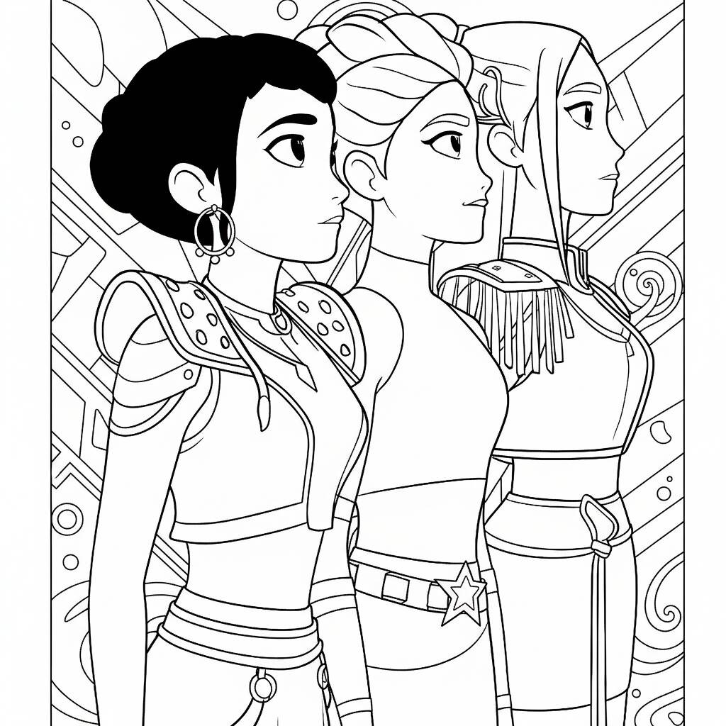A fun coloring page featuring K-Pop warriors, perfect for fans and art lovers.