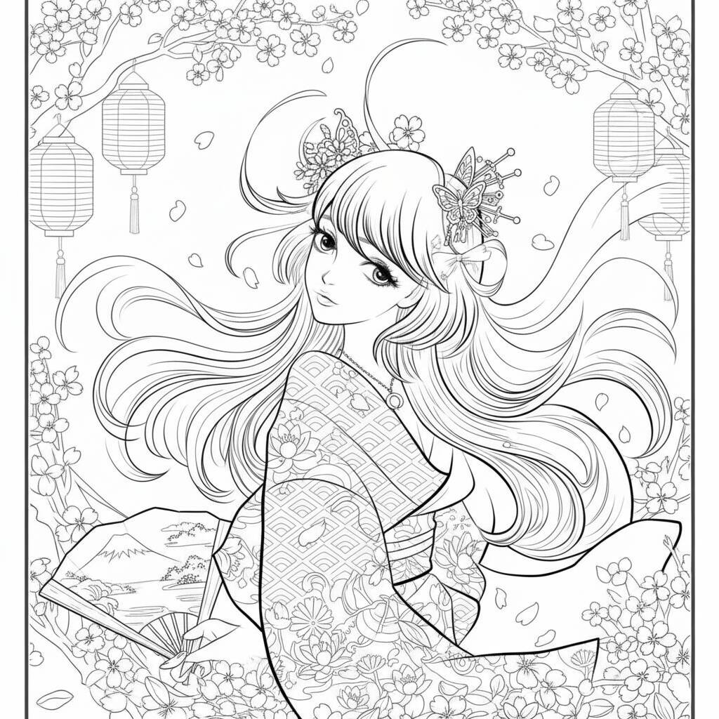 A beautiful coloring page of a girl in kimono, inspired by anime art, perfect for coloring fans.