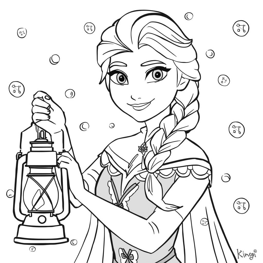 In Anna's drawing from Frozen, she appears smiling, holding a lantern that lights the way through a snowy landscape. To color, start with Anna's dress, using a vibrant purple for the top and a lighter blue for the skirt, reflecting the beauty of winter. You can add gold details to the lantern, creating a charming contrast with the snow-white background.