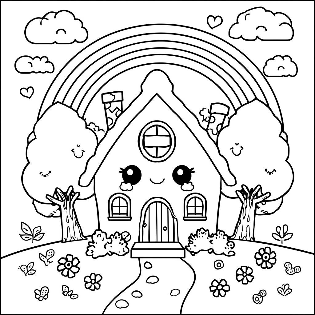 This Kawaii House coloring page features an adorable little house with a smiling face, surrounded by cute trees and colorful flowers. The sky is framed by a radiant rainbow, which brings a feeling of joy and happiness. When coloring, you can use pastel tones to bring this enchanting scene to life, such as pink, blue and yellow, creating a magical and dreamy atmosphere.