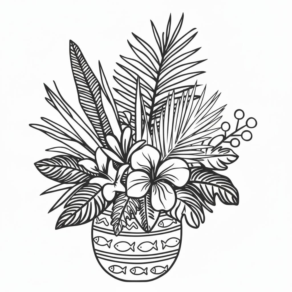 Coloring a beautiful arrangement of tropical flowers in a vase, ideal for relaxing and stimulating creativity.