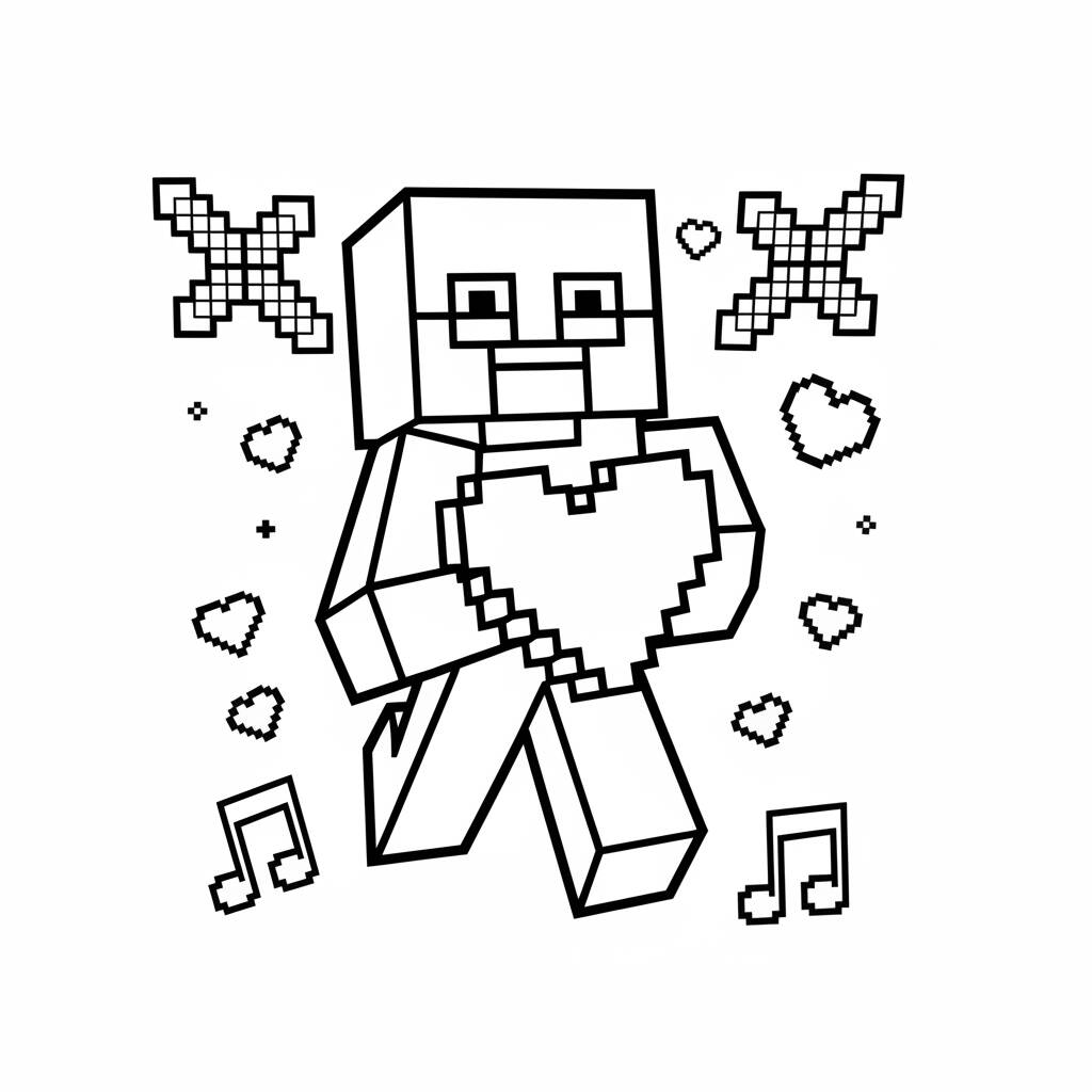 Minecraft themed coloring page with a character holding a heart, perfect for fans of the game.