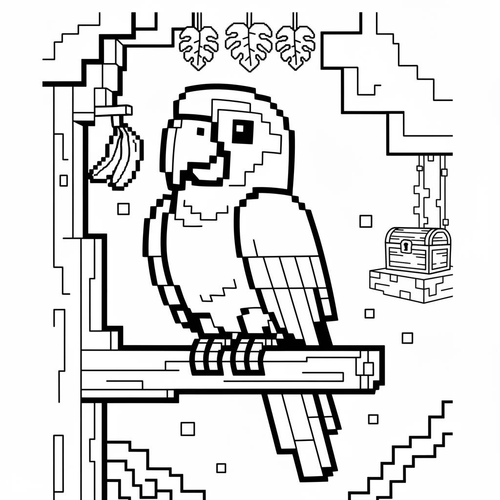 Minecraft themed coloring page featuring a parrot in a pixelated environment.