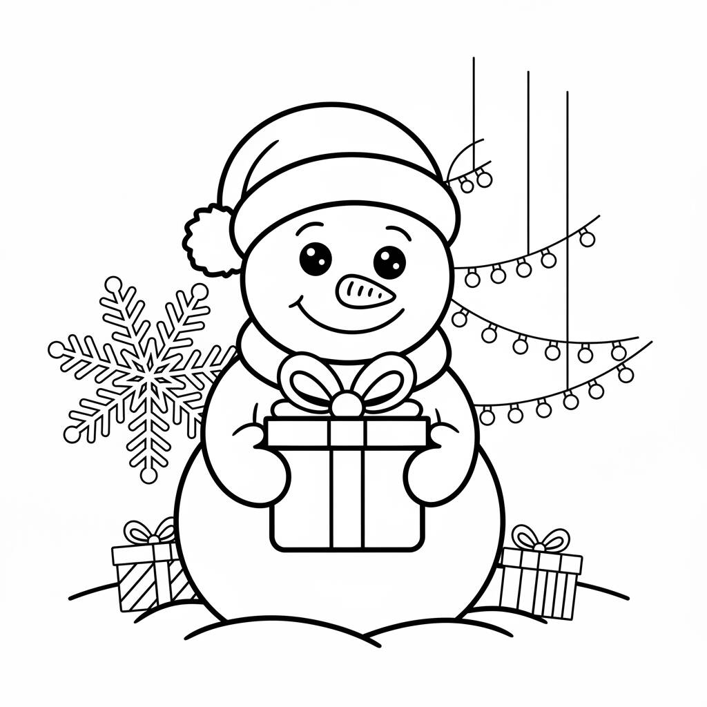 A fun Christmas drawing with a snowman and gifts, perfect for children Coloring Page.