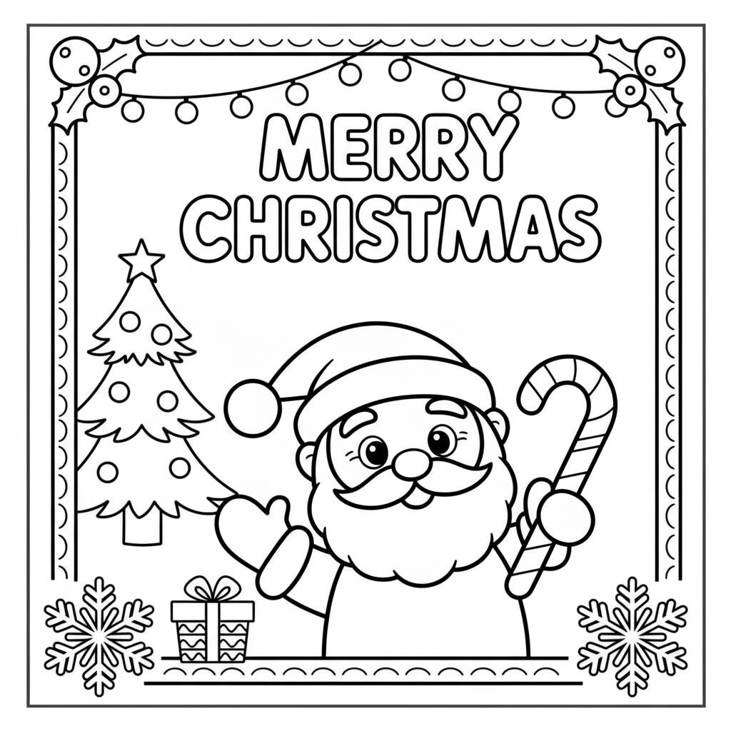 A fun coloring page with Santa Claus, a Christmas tree and festive elements to entertain children during Christmas.