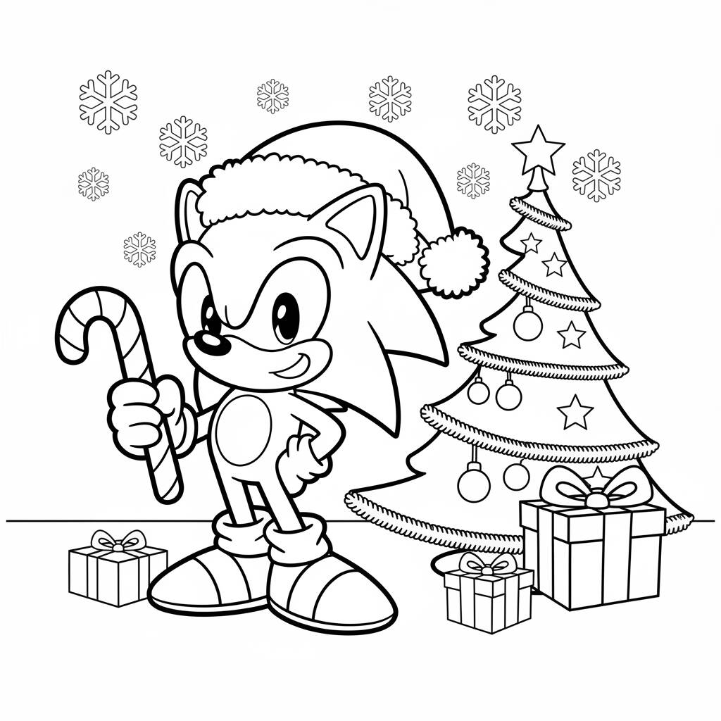 Christmas themed coloring page featuring Sonic, including a Christmas tree and presents.