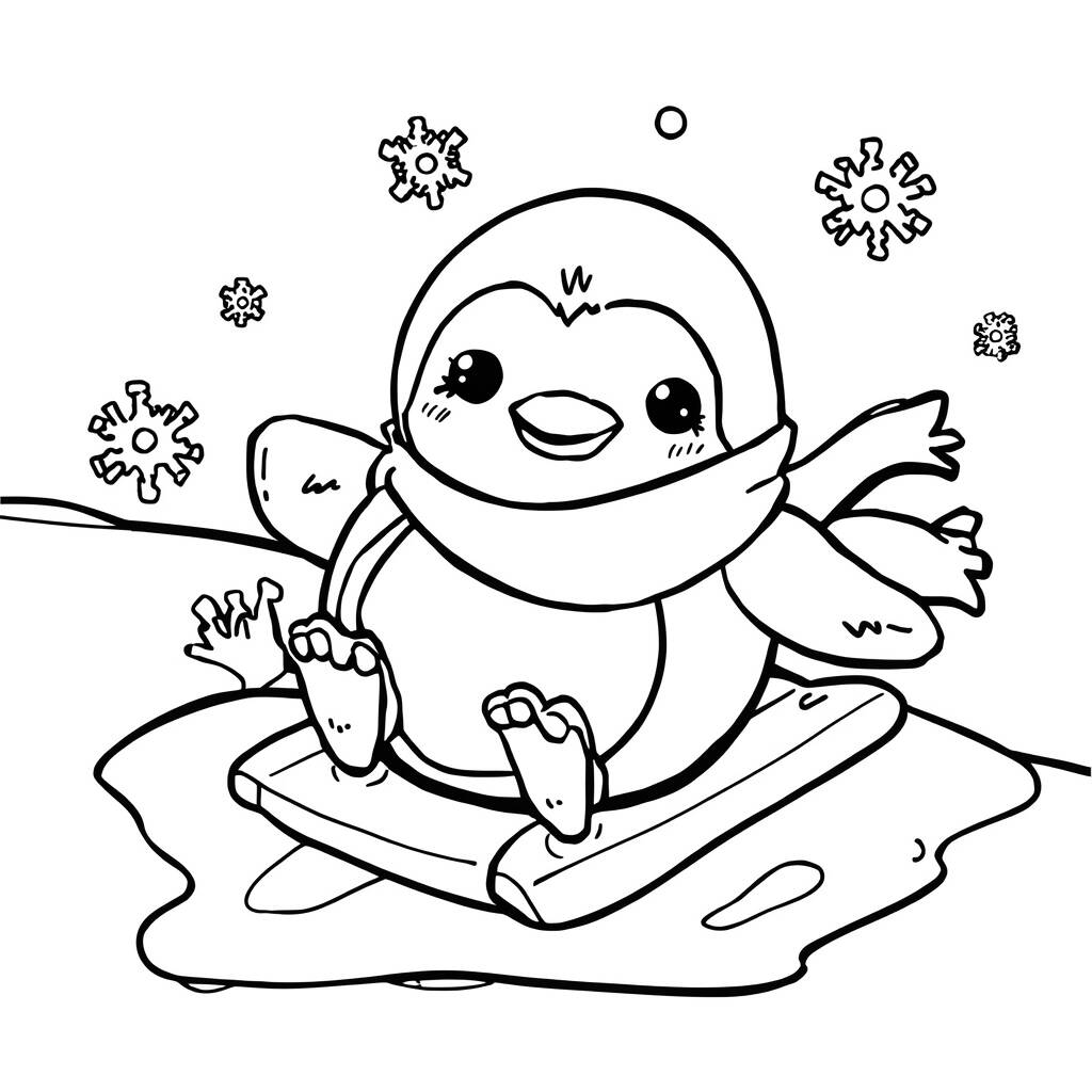 In this kawaii penguin drawing, imagine an adorable penguin gliding happily across the ice. With a colorful scarf around his neck and a charming smile, he is surrounded by snowflakes that gently fall around him. The penguin's expressions convey a sense of happiness and fun, making him perfect for coloring. Use vibrant colors for the scarf and soft tones for the penguin's body, creating a magical winter scene.