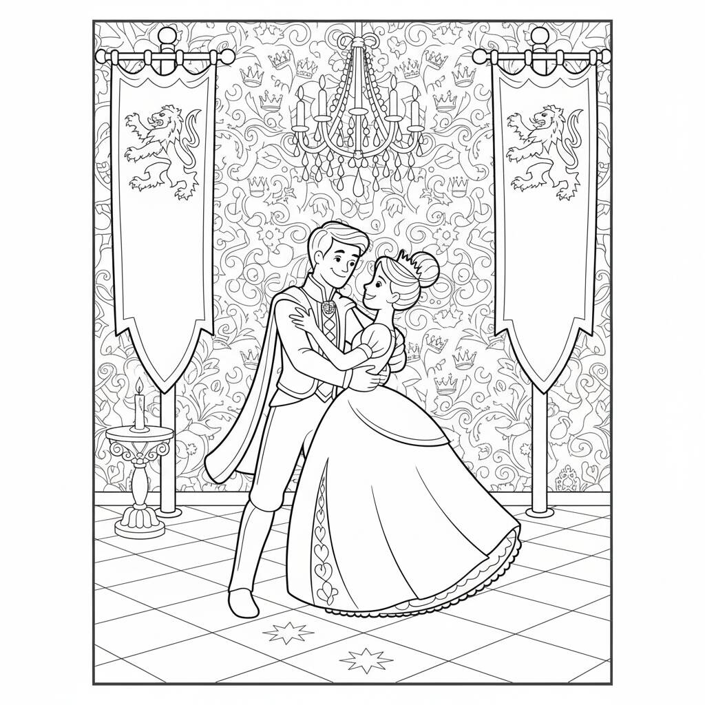 An enchanting coloring page featuring a princess and her prince dancing in an elegant setting.