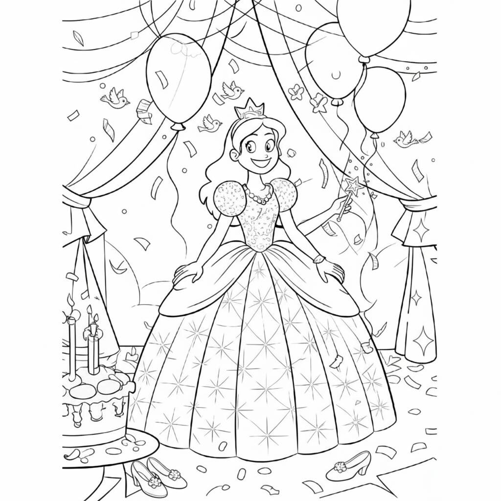 Coloring page with a princess at a party, surrounded by balloons and confetti.