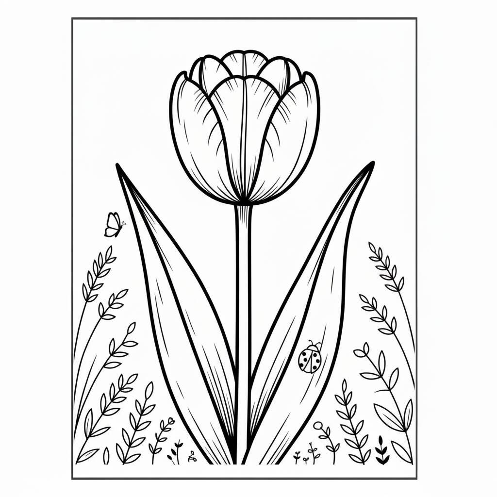 A beautiful coloring page with a tulip and natural elements around it, perfect for children and adults.