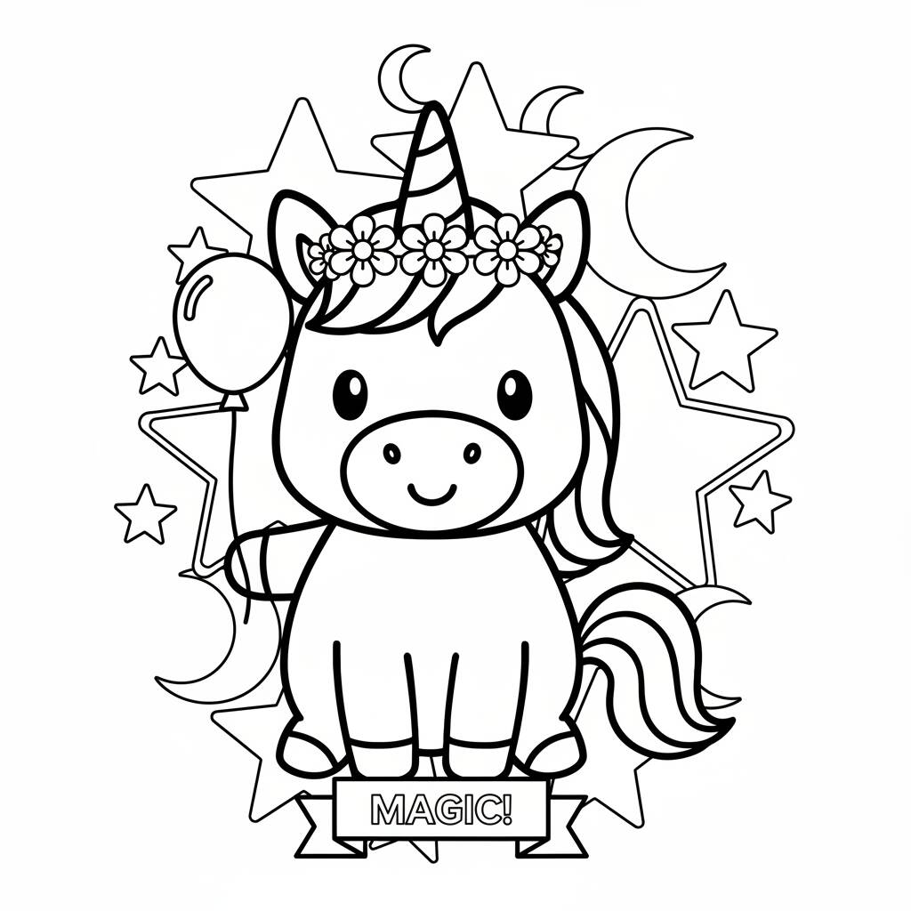 Coloração divertida com um unicórnio encantador segurando um balão e cercado por estrelas e luas.