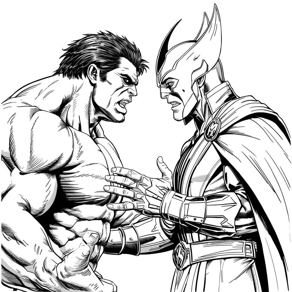 In the exciting confrontation between the Hulk and Loki, the Hulk's enormous power stands out in his imposing posture, with defined muscles and an expression of determination. For coloring, choose a vibrant green for Hulk's body, contrasting with the details of his purple pants. Loki, the god of mischief, brings a touch of magic and mystery with his green and gold costume. Use rich shades of green for your cloak and bright gold for your adornments, creating a stunning effect that highlights your cunning and charm.