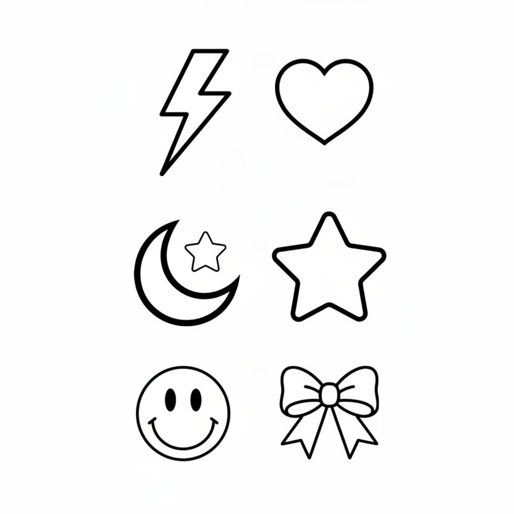 A collection of doodles with icons like stars, hearts and smiles, perfect for coloring activities.