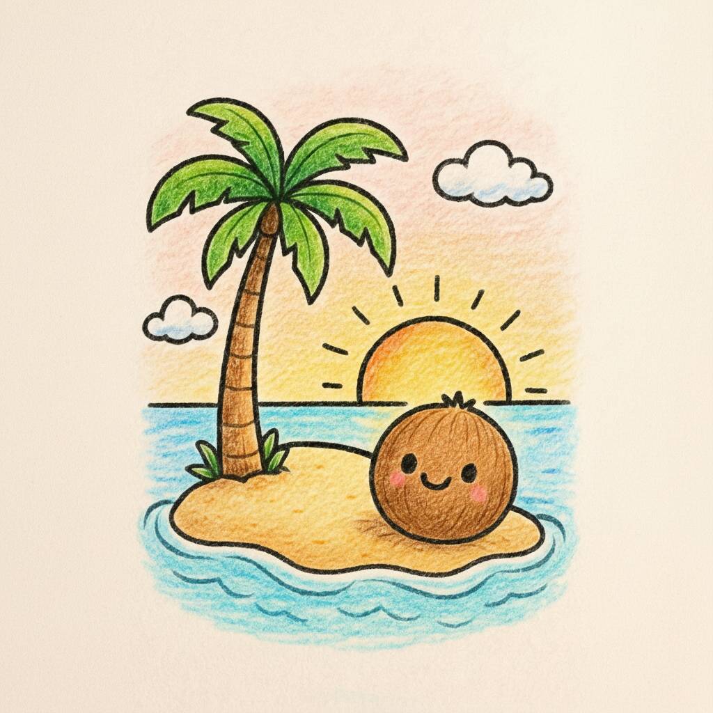 Color a charming tropical island landscape with palm tree and sun, perfect for relaxing.