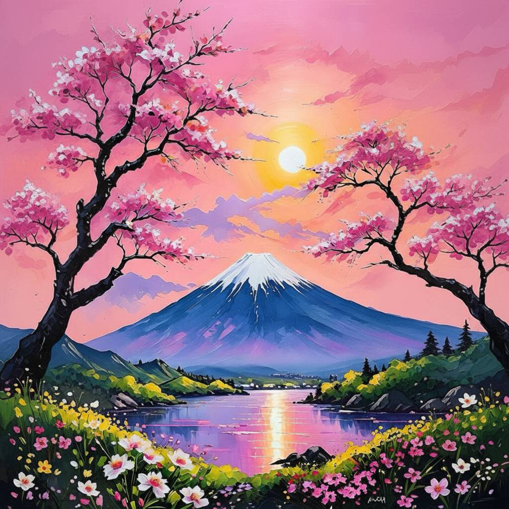 A beautiful landscape Coloring Page in, featuring a majestic mountain, cherry blossoms and a stunning sunset.