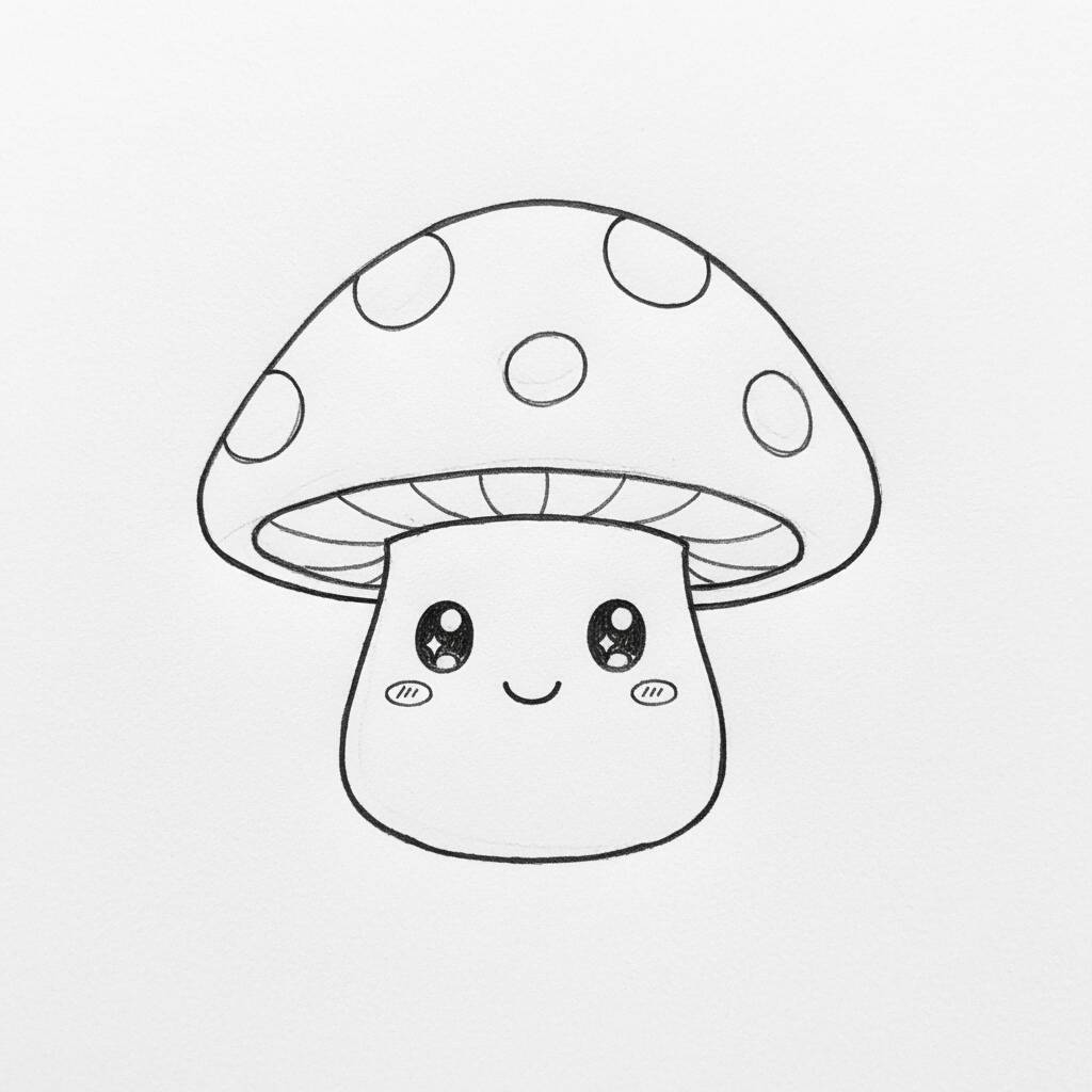 Un adorable dibujo de un hongo con una cara sonriente, perfecto para quienes buscan ideas creativas de dibujo.