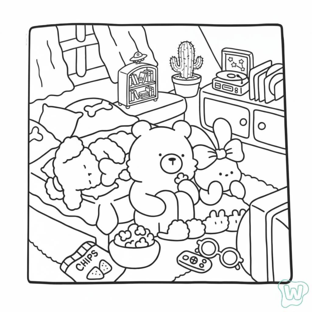 Una divertida página para colorear de Cozy Friends relajándose y viendo televisión, perfecta para niños y fanáticos de los momentos acogedores.