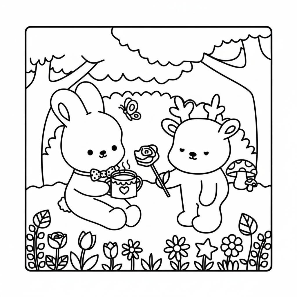 Un encantador dibujo para colorear con lindos amigos en el bosque, ideal para estimular la creatividad de los niños.