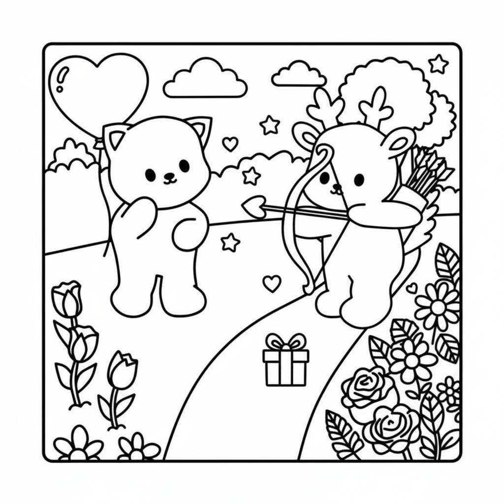 Una encantadora página para colorear de la serie Cozy Friends, que presenta lindos animales en un parque, perfecta para estimular la creatividad.