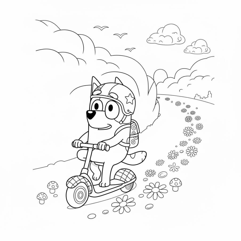 Uma divertida página de colorir da Bluey se divertindo em um patinete, perfeita para crianças criativas.
