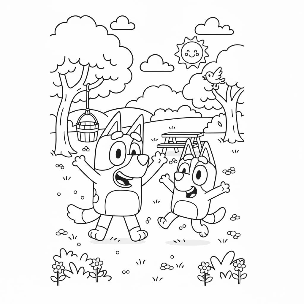 Divertido dibujo para colorear con Bluey y Bingo divirtiéndose en el parque, perfecto para niños.