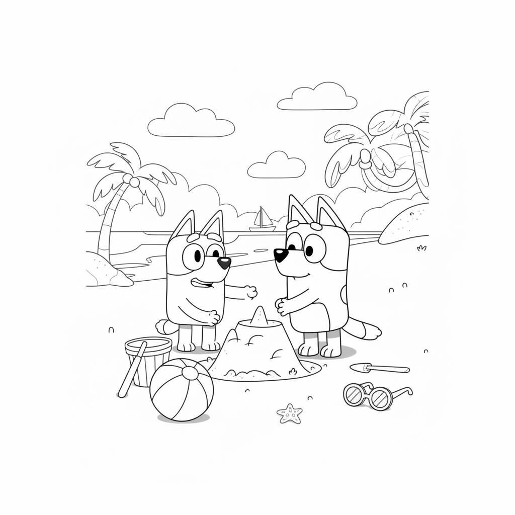 Diviértete coloreando a Bluey y Bingo mientras juegan en la playa, construyen castillos de arena y disfrutan del sol.