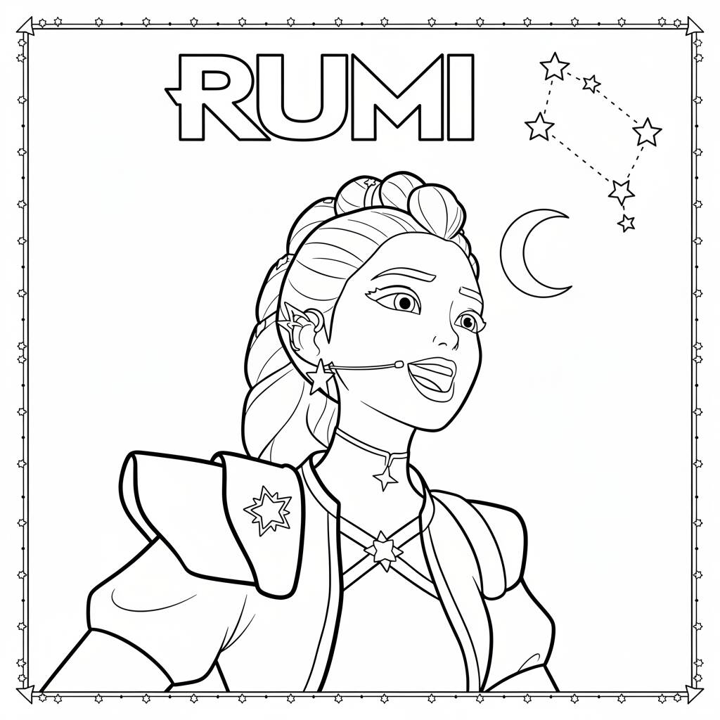 Divertida página para colorear del personaje Rumi, uno de los guerreros del K-Pop, perfecta para fans del K-Pop y actividades creativas.