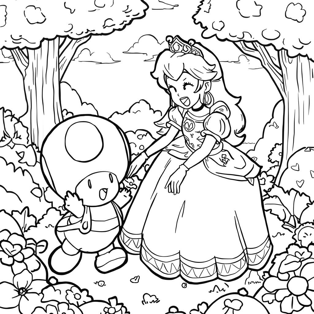 En el reino de los hongos, la princesa Peach y su fiel amigo Toad se divierten en un día soleado. Se ríen y juegan entre las coloridas flores y los altos árboles, que crean una escena encantadora. La Princesa, con su vestido rosa brillante y su cabello dorado, luce radiante junto a Toad, quien siempre está listo para una nueva aventura. Juntos, exploran cada rincón del reino, recolectan setas mágicas y hacen nuevos amigos en el camino.