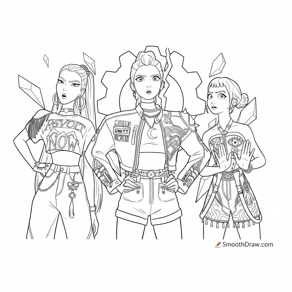 Comenzar » Dibujos para colorear » Dibujo para colorear de Guerreiras do K-Pop con estilo rebelde