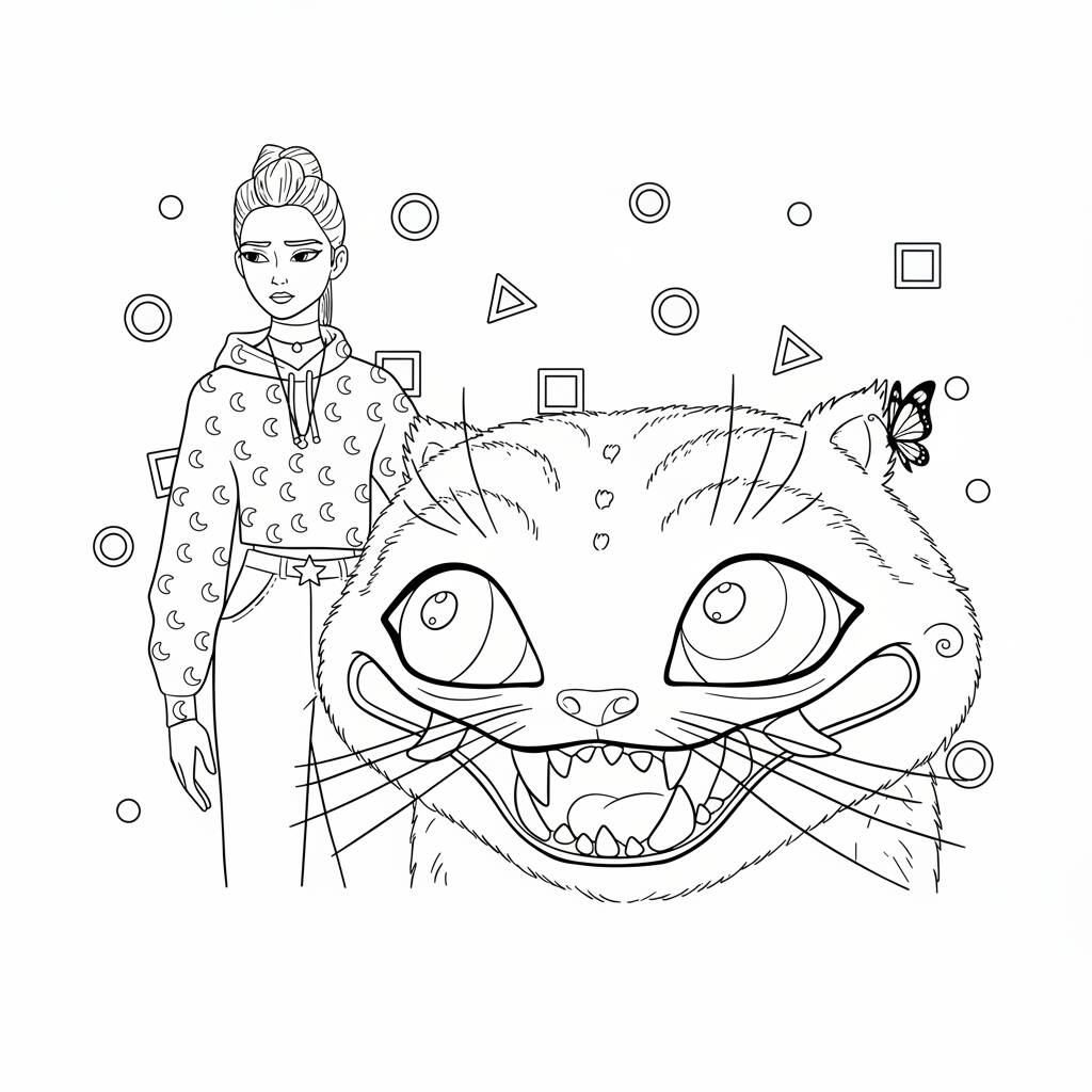 Una página para colorear inspirada en los guerreros del K-Pop, que presenta un personaje elegante y un gato divertido.