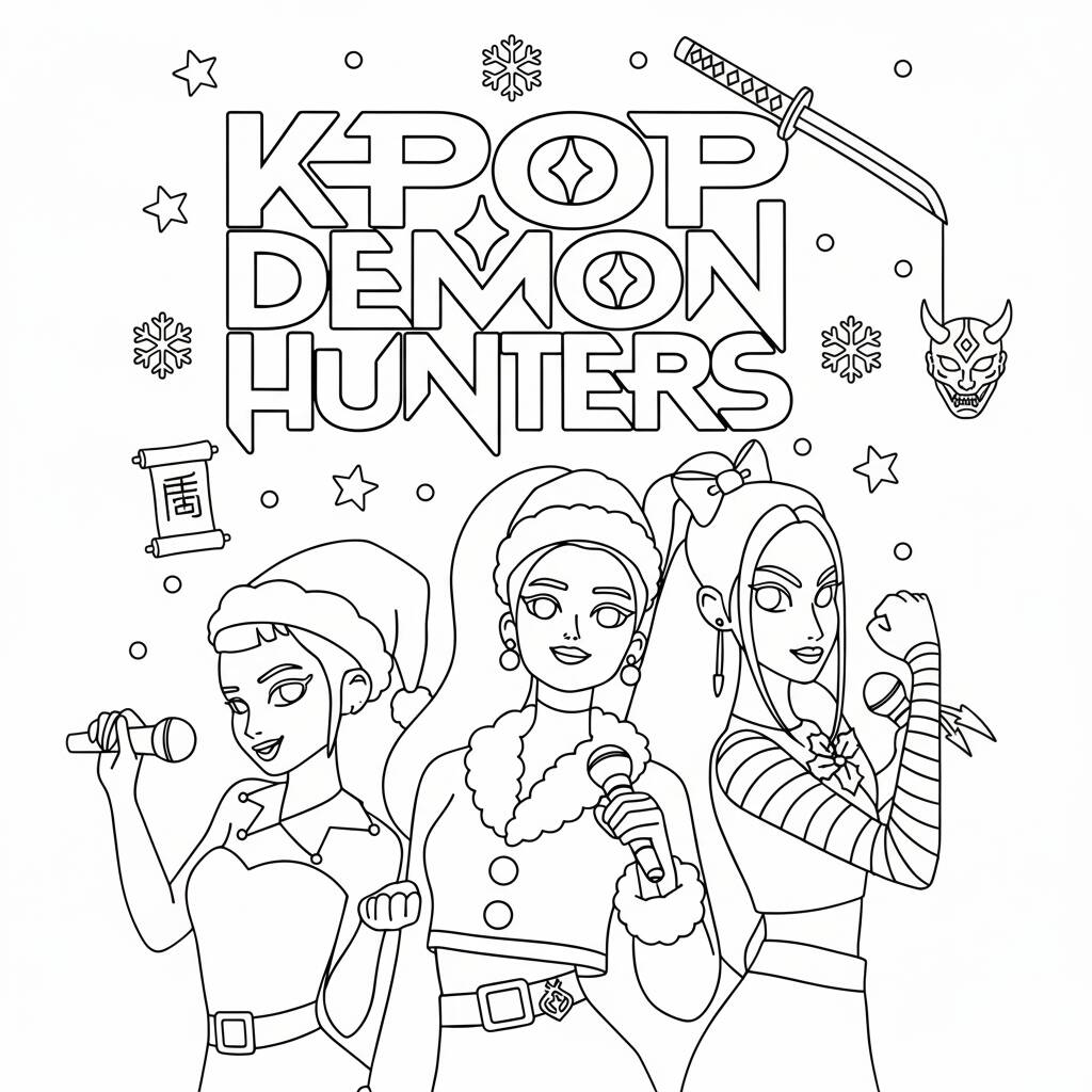Una divertida página para colorear con K-Pop Warriors en el tema Demon Hunters, perfecta para los fanáticos del K-Pop y el arte.