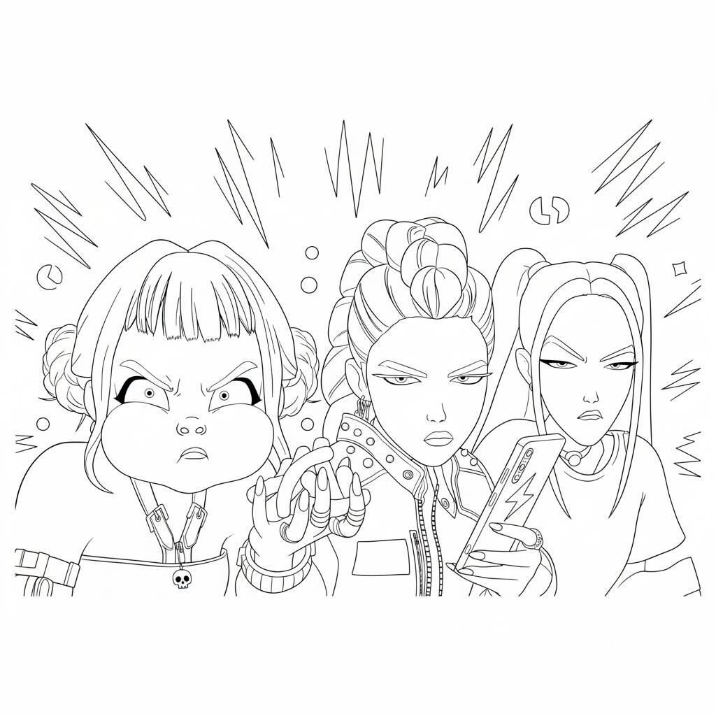 Una emocionante página para colorear de K-Pop Warriors, perfecta para los fanáticos que aman el arte y la creatividad.