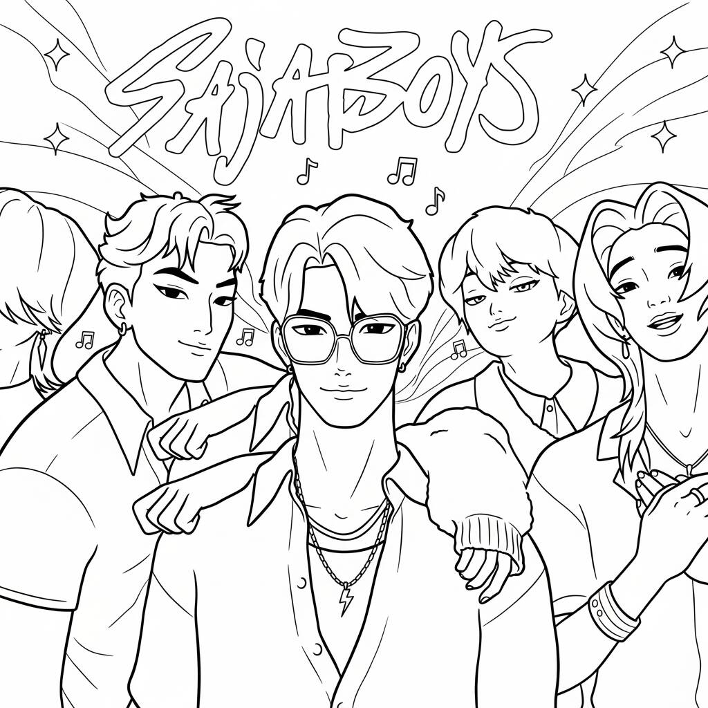 Una divertida página para colorear inspirada en los guerreros del K-Pop, perfecta para los fanáticos que aman el arte y la música.