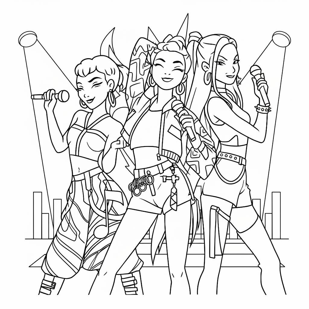 Una divertida página para colorear que presenta a los guerreros del K-Pop en una presentación emocionante, perfecta para fanáticos de todas las edades.