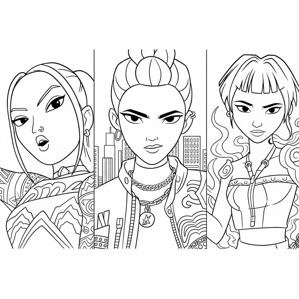 Uma página de colorir com ilustrações de guerreiras do K-Pop, perfeita para fãs e amantes de arte.
