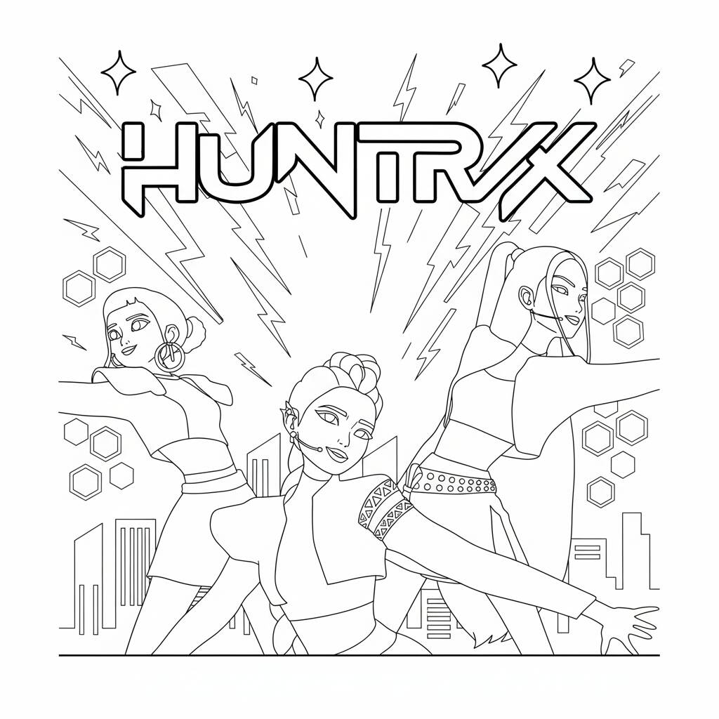 Colorea divertido con los K-Pop Huntrax Warriors, ideal para fanáticos de la música y el arte.