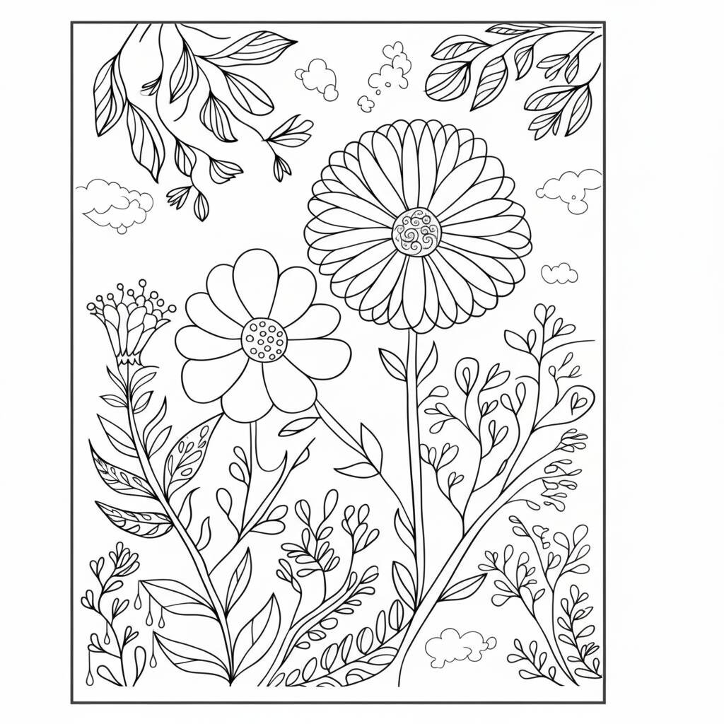 Un precioso dibujo para colorear con diferentes flores y hojas, perfecto para relajarte y dar rienda suelta a tu creatividad.