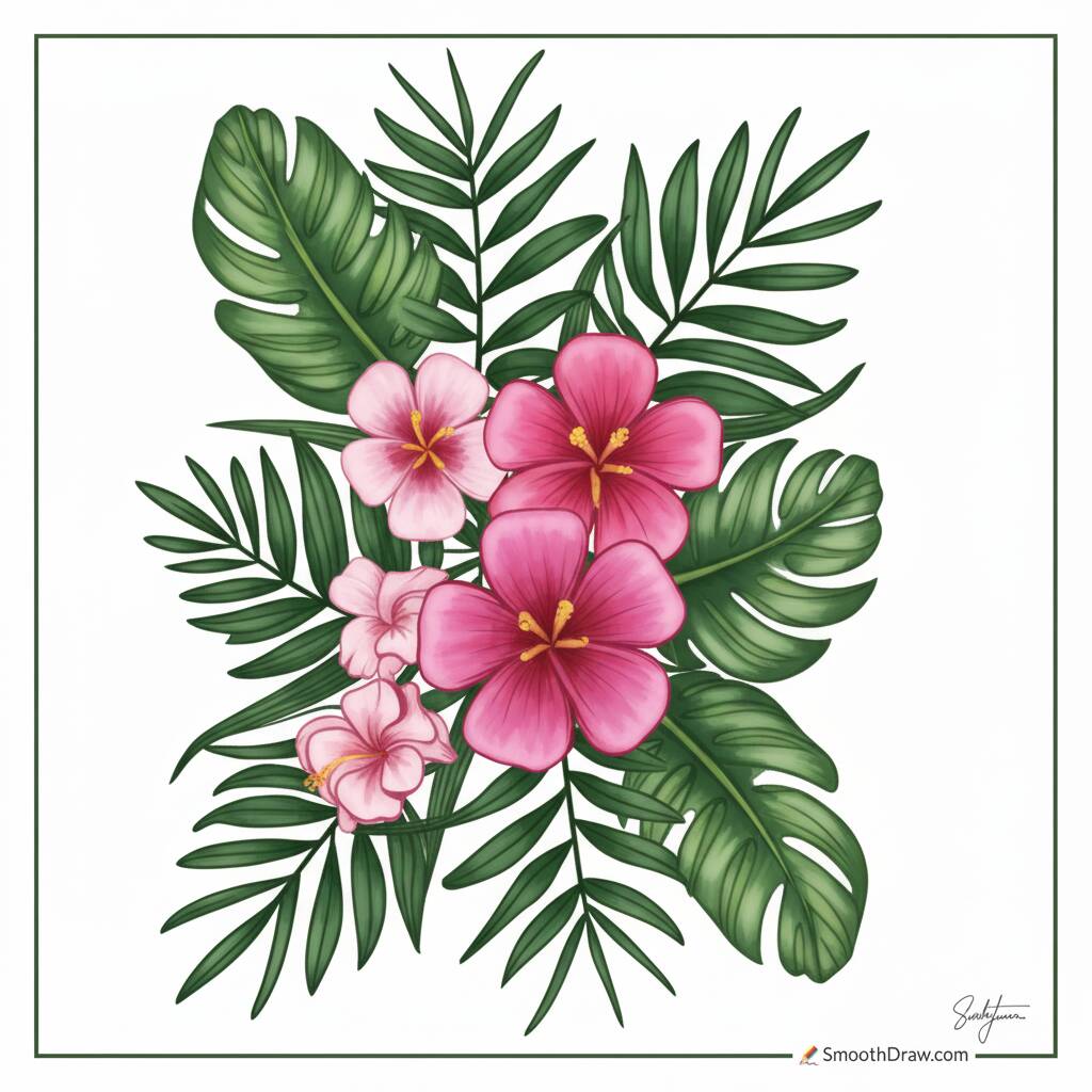 Un precioso dibujo para colorear con flores tropicales, perfecto para estimular la creatividad y relajarse.