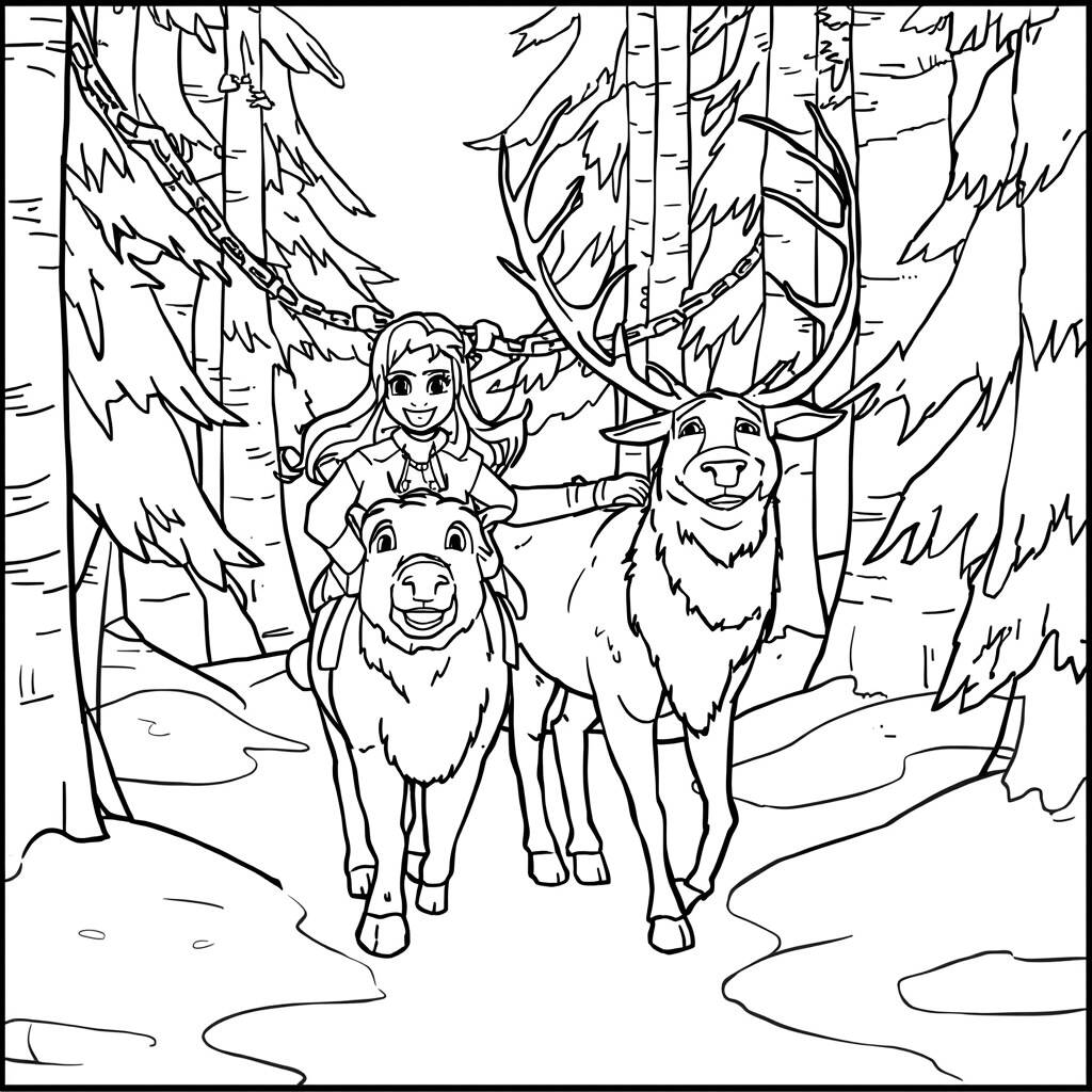 En el corazón de un bosque cubierto de nieve, Kristoff y Sven se preparan para una emocionante aventura. El frío invernal no les impide explorar nuevos caminos y descubrir secretos escondidos entre los árboles. Mientras Kristoff, vestido con su traje de piel de reno, observa el mapa, Sven, su fiel amigo, está listo para seguir adelante, ansioso por vivir nuevas experiencias. Sueñan con conocer criaturas mágicas y tal vez incluso con un nuevo amigo que los ayude en su viaje.
